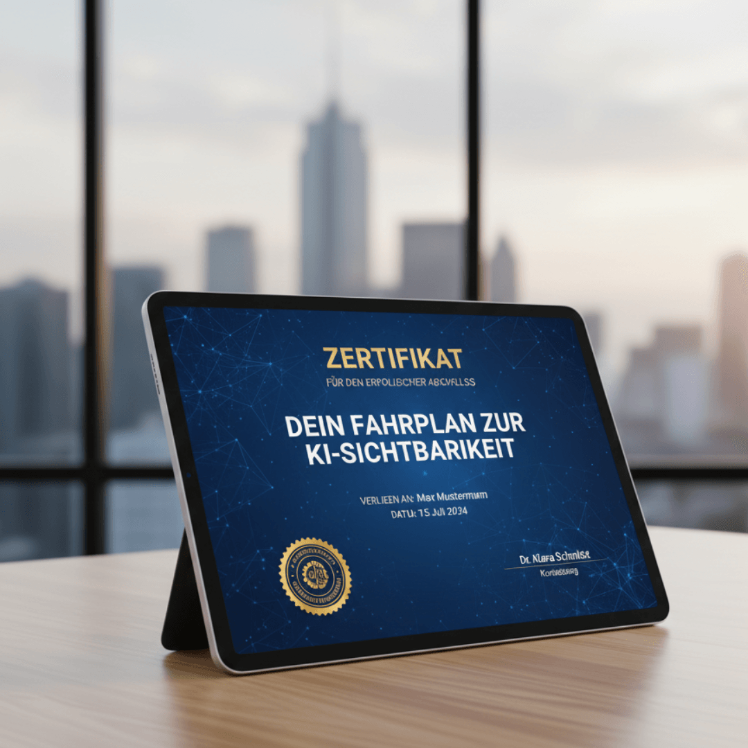 Sie bekommen nach der Teilnahme ein Kurszertifikat zur Teilnahme der "KI-Search Mastery" als Nachweis, der neu erlernten Fähigkeiten.